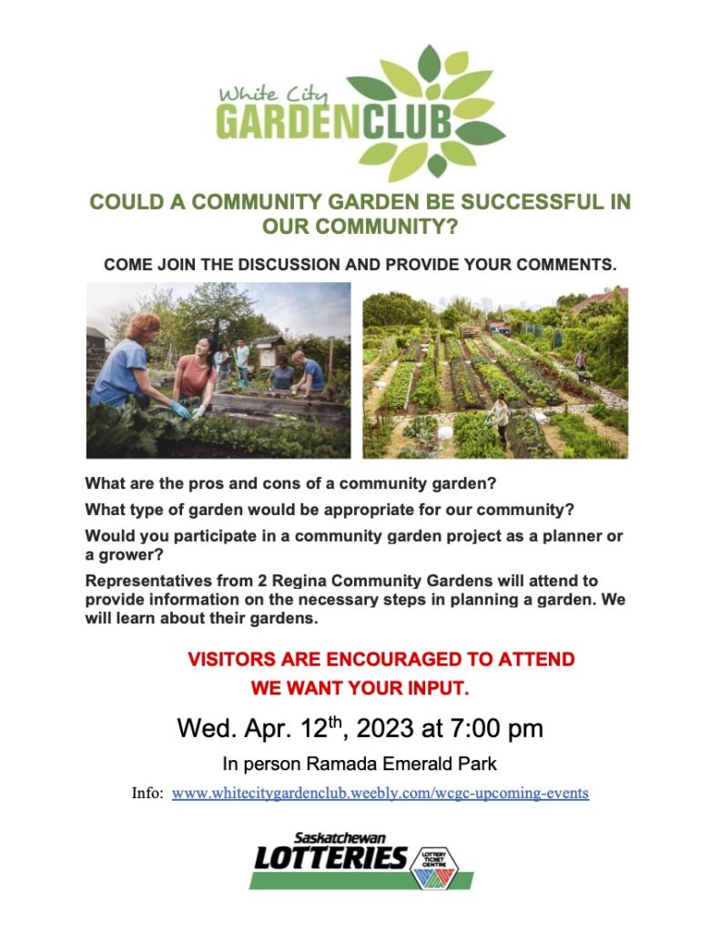August 30, 2023 April 12th – Planning a Community Garden 284 284 people viewed this event. Register for event To register for this event email your details to wcgc.communications@gmail.com Register using webmail: Gmail / AOL / Yahoo / Outlook Date And Time 2023-04-12 @ 07:00 PM to 2023-04-12 @ 09:00 PM Location Ramada Emerald Park/Regina East Event Types In-person Event Category Educational Session Share With Friends Facebook Twitter Linkedin Xing Pinterest
